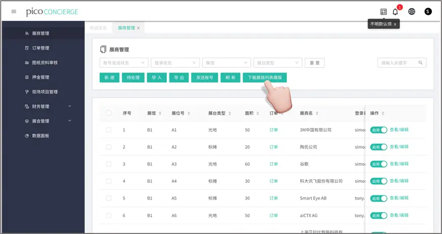 展商管理:導入?yún)⒄股虜?shù)據(jù)、新建展商、啟用禁用展商、導出展商信息