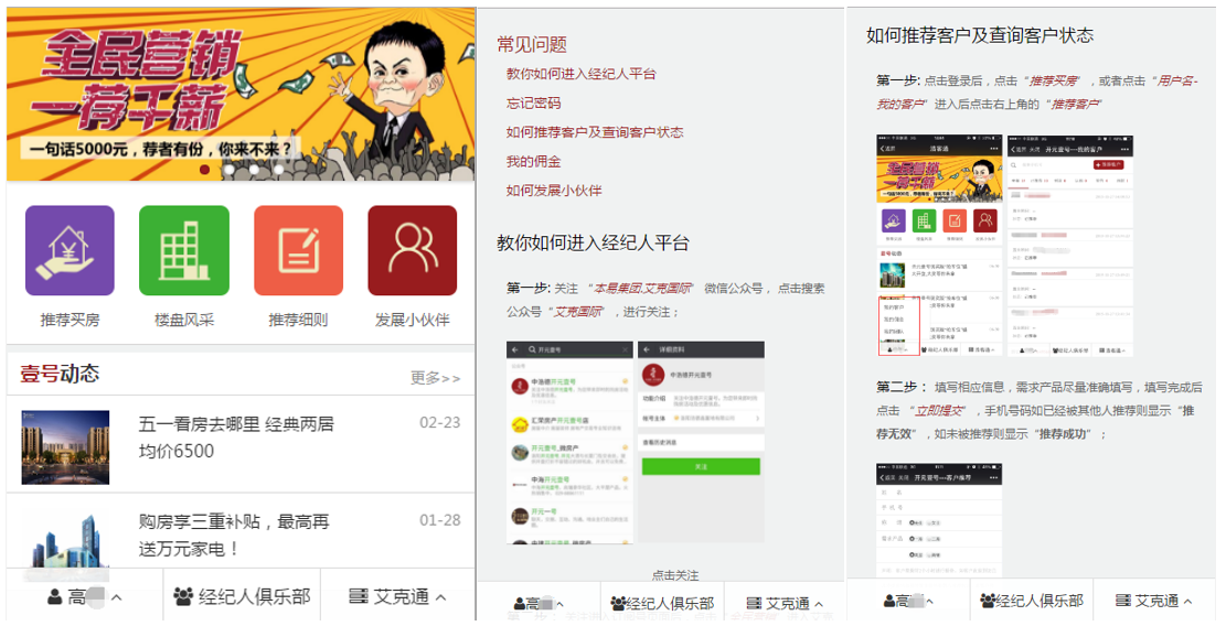 客戶注冊:擁有微信并關(guān)注公眾號,即可注冊申請成為全民營銷系統(tǒng)的用戶(全民經(jīng)紀(jì)人)。注冊用戶可隨時通過微信查看已經(jīng)推薦的客戶信息、購房進度、傭金結(jié)算情況。