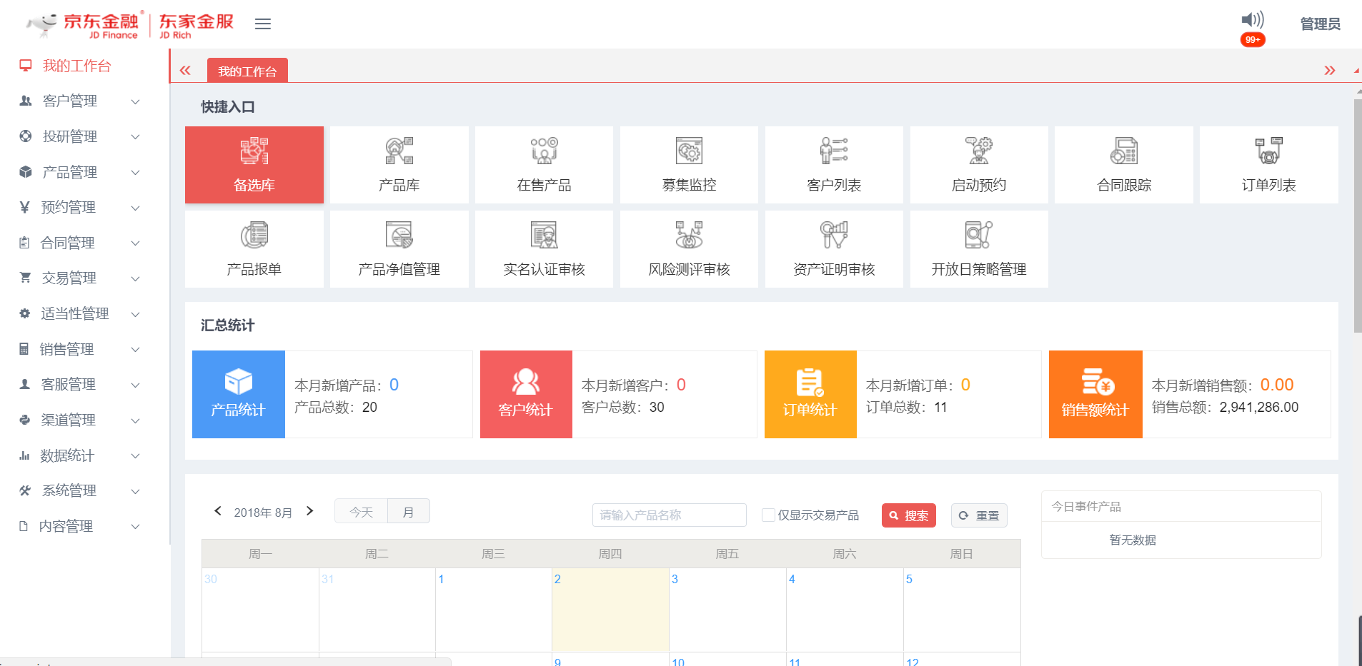 • 我的工作臺:提供系統(tǒng)菜單快捷入口,統(tǒng)計核心業(yè)務數(shù)據(jù)及開放期內的產(chǎn)品日歷事件展示