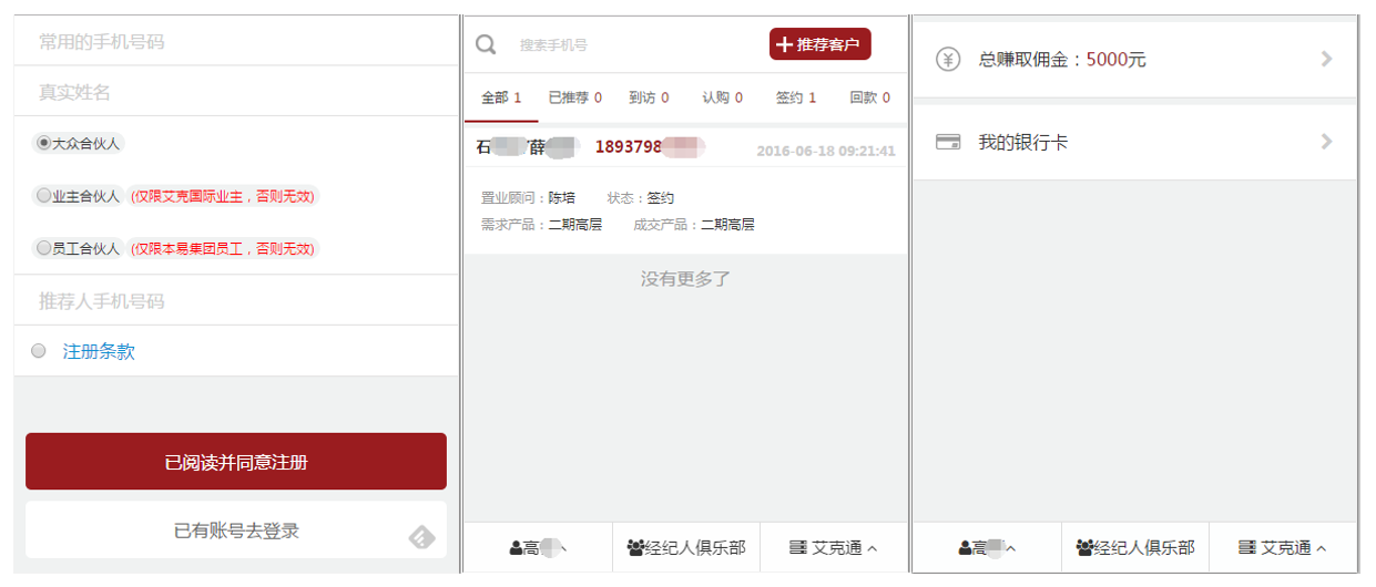 客戶注冊:擁有微信并關(guān)注公眾號,即可注冊申請成為全民營銷系統(tǒng)的用戶(全民經(jīng)紀(jì)人)。注冊用戶可隨時通過微信查看已經(jīng)推薦的客戶信息、購房進度、傭金結(jié)算情況。